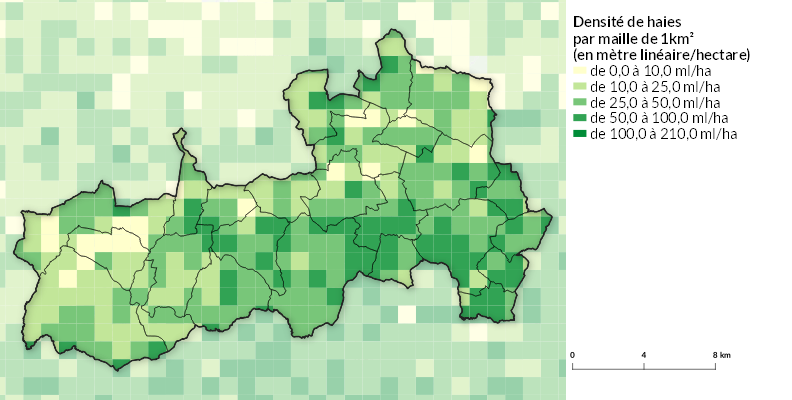 La densité de haies moyenne sur l’intercommunalité est de 37.21 ml/ha (mètres linéaires par hectare), soit 1046.38 km de haies au total.