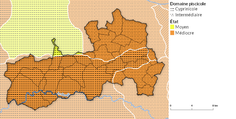 Le réseau hydrographique et son peuplement de poissons sont analysés selon le « contexte piscicole ». Le principe du découpage des cours d’eau en contexte piscicole est le suivant : dans chaque unité, une population de poissons doit pouvoir accomplir l’intégralité de son cycle vital (reproduction, croissance…). On distingue ainsi, en fonction du type de poissons, trois types de peuplement :