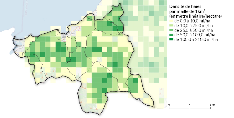 La densité de haies moyenne sur l’intercommunalité est de 20.64 ml/ha (mètres linéaires par hectare), soit 568.24 km de haies au total.