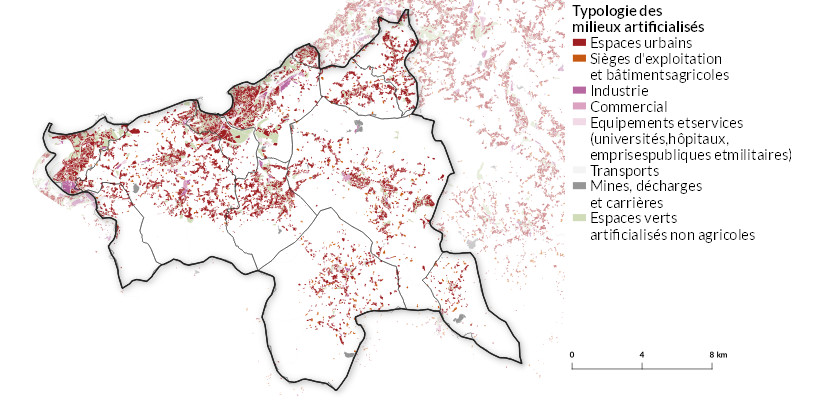 Ces espaces correspondent aux zones urbanisées, industrielles ou commerciales, à celles aménagées pour les sports et les loisirs, aux réseaux de transport (routes, voies ferrées, parking), aux mines, carrières, chantiers, aux espaces verts (parcs).