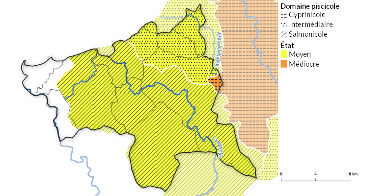 Le réseau hydrographique et son peuplement de poissons sont analysés selon le « contexte piscicole ». Le principe du découpage des cours d’eau en contexte piscicole est le suivant : dans chaque unité, une population de poissons doit pouvoir accomplir l’intégralité de son cycle vital (reproduction, croissance…). On distingue ainsi, en fonction du type de poissons, trois types de peuplement :