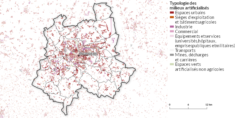 Ces espaces correspondent aux zones urbanisées, industrielles ou commerciales, à celles aménagées pour les sports et les loisirs, aux réseaux de transport (routes, voies ferrées, parking), aux mines, carrières, chantiers, aux espaces verts (parcs).