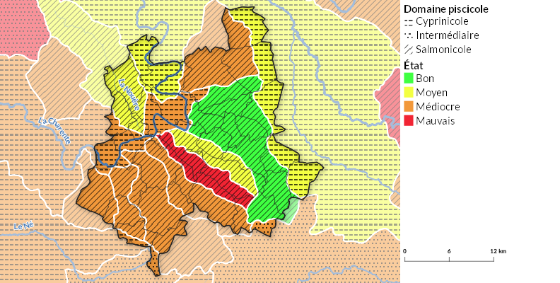 Le réseau hydrographique et son peuplement de poissons sont analysés selon le « contexte piscicole ». Le principe du découpage des cours d’eau en contexte piscicole est le suivant : dans chaque unité, une population de poissons doit pouvoir accomplir l’intégralité de son cycle vital (reproduction, croissance…). On distingue ainsi, en fonction du type de poissons, trois types de peuplement :
